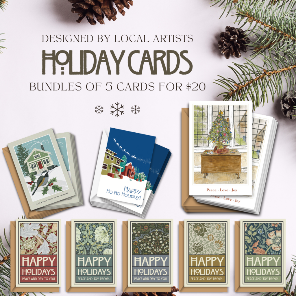 Heidi Favour and Linda Sewell, our talented volunteer graphic designers, have produced three outstanding holiday cards for purchase exclusively from Historic Wallingford. For 2024, we’ve added a fourth card featuring original art by the late Glenn Singer. Get yours while supplies last!